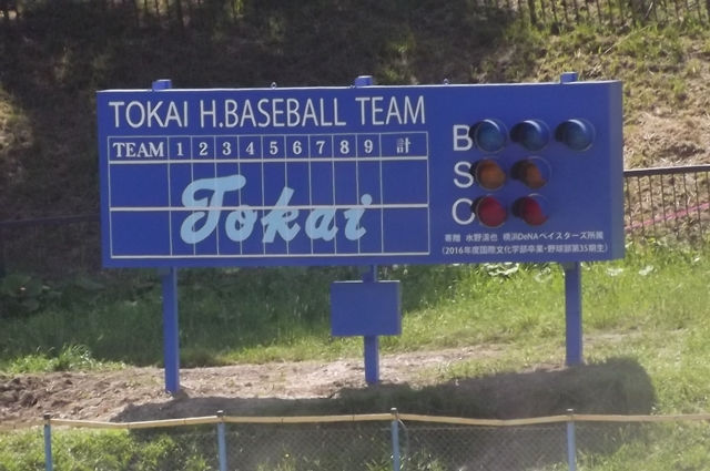 (画像クリックで写真) 今日は午後から紅白戦でした。気温は連日の30℃越え、おそらくは32から33℃野球観戦もぐったりです。グランドに着くとセンター後方にTOKAIロゴ入りのベイスターズカラーの真新しいスコアボードが!!(水野前会長は東海ブルーと言ってました!) OBの水野滉也くんからのプレゼントです!水野選手、ありがとうございます!!<(_ _)> みなさんもグランドに足をお運びの際はよく見て来て下さい。ちゃんと名前も入ってます。バッターはそこに打球当てないように!そこに打つ時はスコアボードを越える打球でお願いします。(今川、赤尾ぶつけんなよ!)話は試合に戻しますが、暑い中、選手は必死になって白球を追っていました。わたしは、今日ハーフ熱中症でした。みなさんも、こまめな水分補給で暑い夏の野球観戦をして下さい!